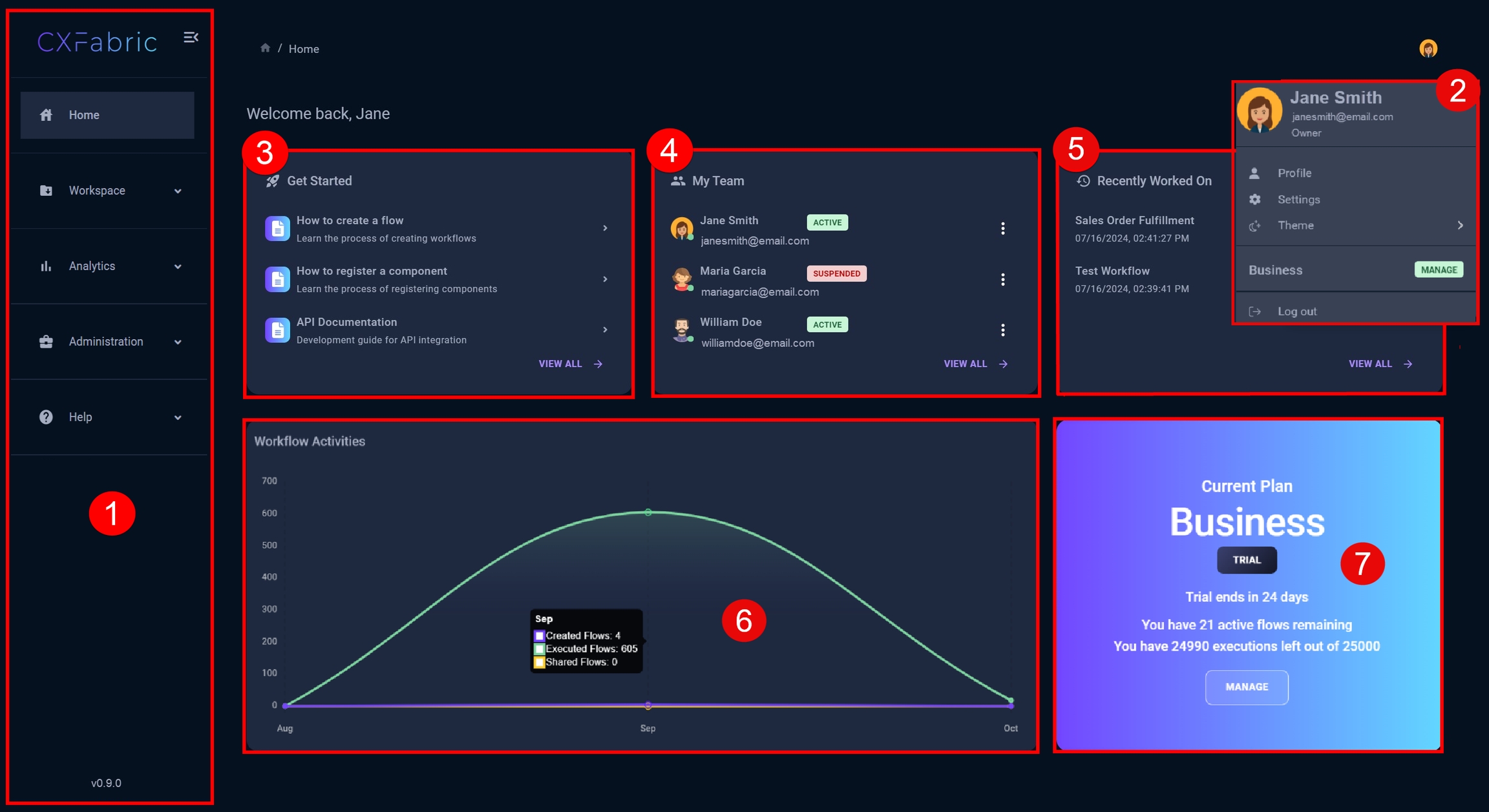 Workflow Activities: The Workflow Activities section provides a graphical representation of recent workflow activity. You’ll see data on created, executed, and shared flows, giving you insights into how workflows are being used across the platform. This helps track workflow trends and identify active processes.